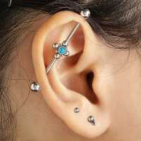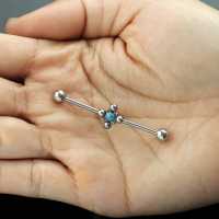 We are proud to introduce this highly polished industrial piercing barbell made using 316L steel piercing and set with a synthetic turquoise cabochon. We try our outmost to create most of our steel piercing jewelry in our own steel jewelry workshop so that we can offer unique but affordable industrial piercing designs in our steel body jewelry wholesale selection.