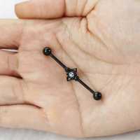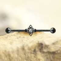 A renaissance inspired scaffold piercing in the form of a filigree heart design. We have done this with a black PVD gold coating and set with a clear crystal to give this industrial barbell a very fancy look. Discover a wide assortment of other unique industrial piercing designs in our steel body piercing jewelry wholesale shop.