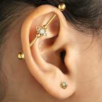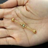 A industrial piercing barbell with a filigree heart design gives this a classic renaissance look. PVD gold coated and decorated with a synthetic white opal cabochon give this industrial barbell a very irresistible look. We offer a wide assortment other unique industrial piercing designs to be discovered in our steel body piercing jewelry wholesale collection.