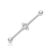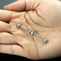 In our extensive wholesale steel body jewelry collection we have a whole sub-category showcasing our exclusive industrial piercing barbells. This scaffold piercing design is made from steel piercing barbells, a couple of steel hearts and a synthetic white opal all welded together in our steel jewelry workshop.