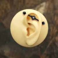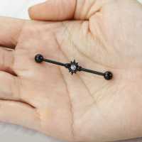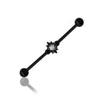 This industrial piercing style will come out like a sparkling star in the middle of the night. We have adorned this construction piercing with tiny like spikes and piercing balls and used a black PVD plating finish. The centre piece in this industrial barbell is a clear sparkling zircon crystal. Available in many different colors in our wholesale steel piercing collection.