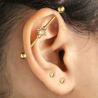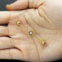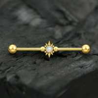 An absolute stunner of a scaffold piercing with a centre that is welded together in the shape of a star with a synthetic white opal set in the middle. This industrial piercing has been finished off with a high quality PVD gold plating. Also available in steel and black in our wholesale steel piercing section.