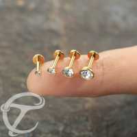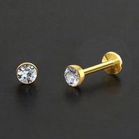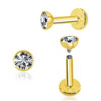 A very clean simple PVD gold coated labret piercing design with a dome shaped cup and a clear zirconia crystal. Great to use as lip piercing jewelry as well in the ear as tragus piercing and flat piercing.
