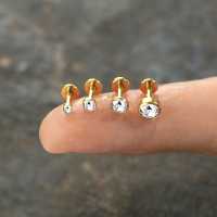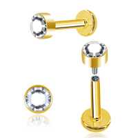 A very clean simple PVD gold coated labret piercing design using a clear flat back zirconia crystal. Perfect to be worn as lip piercing jewelry as well in the ear as tragus piercing and flat piercing.
