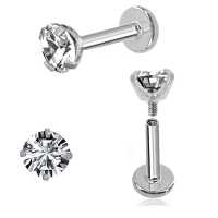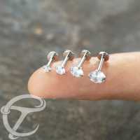 A simple elegant crystal labret piercing design with a prong set clear crystal. These type of minimalist steel labrets are great to wear as monroe piercing, tragus piercing as well as flat piercing and helix piercing.