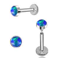 A 316L steel piercing labret with a synthetic blue opal cabochon. This labret piercing is available in many sizes and colors in our wholesale steel body jewelry collection.