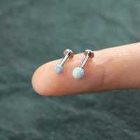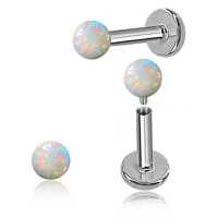 This exclusive labret piercing is decorated with a white synthetic opal ball. Ready available in 3 and 4mm this steel labret is ideal to wear as tragus piercing, upper lobe piercing and flat piercing.