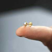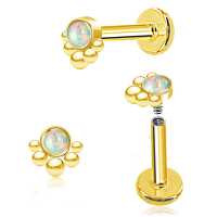 Our large labret piercing assortment is exclusive to Chaotic Trading's wholesale body piercing collection. Here we like to present our steel piercing clusters welding method with a PVD gold coated steel labret with a synthetic white opal cabochon.