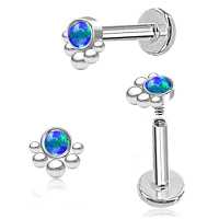 Our extensive labret piercing assortment is exclusive to Chaotic Trading's wholesale body piercing collection. Here we showcase our steel piercing clusters welding method with a 316L steel labret set with a synthetic blue opal cabochon.