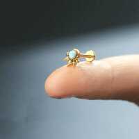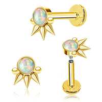 Using an innovative piercing clusters welding method our steel jewelry smiths have created this PVD gold plated steel piercing labret with a synthetic white opal cabochon. Sold as labret piercing but also great to wear in the ear as flat piercing or lobe piercing.