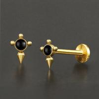 This dagger shaped PVD gold coated steel piercing labret has a gothic jewelry feel to it. The shiny black Onyx cabochon is hand set by our steel jewelry workers. Not only to be used as labret piercing but also great as tragus piercing and flat piercing.
