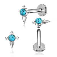 This dagger inspired 316L hypo allergenic steel piercing labret has a gothic jewelry feel to it. The turquoise cabochon is hand set by our steel jewelry designers. Not only to be worn as labret piercing but also suitable as tragus piercing and flat piercing.