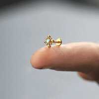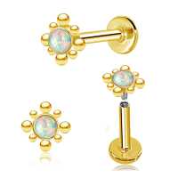 This geometrical steel piercing labret design we stock in lots of variations of stones, colors and sizes. This is the PVD gold plated model with a white synthetic opal cabochon. All labret piercings are being offered at wholesale piercing prices in our exclusive online steel body jewelry shop.