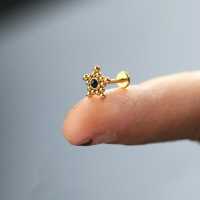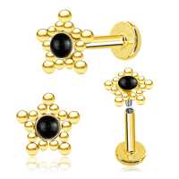 A very popular star steel labret, PVD gold coated and set with a black onyx cabochon. This steel body jewelry is great to wear as a labret piercing or to be worn in the ear as an upper lobe piercing or flat piercing.