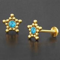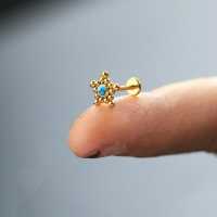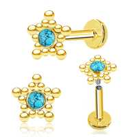 A very popular star steel labret, PVD gold coated and set with a round turquoise cabochon. This steel body piercing jewelry is fabulous to wear as a labret piercing or to be worn in the ear as an upper lobe piercing or flat piercing.
