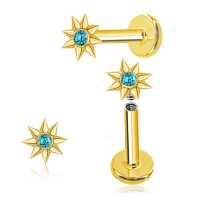 This golden sunburst steel piercing labret has been hand welded by our steel jewelry smiths, set with a turquoise cabochon then finished with a PVD gold plating process. We are super proud to have this exclusive labret piercing sold solely at Chaotic Trading's online wholesale steel body jewelry shop.