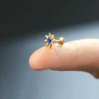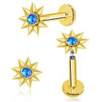 A larger version of our sunburst steel piercing labret. This steel piercing jewelry has been hand crafted by our steel jewelry smiths, set with a synthetic blue opal then PVD gold plated. Perfect for labret piercing, tragus piercing or flat piercing.