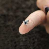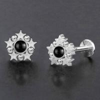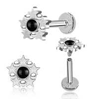 Creating new exiting steel piercing jewelry such as this star studded steel piercing labret is what makes Chaotic Trading very unique. This hypo allergenic labret piercing is welded by hand and set with a black onyx cabochon.