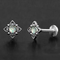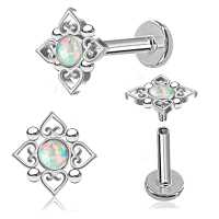 This exlusive plated filigree 316L steel piercing labret have been made by welding together four small steel hearts and steel piercing balls. We finish off this labret jewelry by adding a white synthetic opal. Available in lots of colors and sizes in our extensive steel piercing wholesale section.