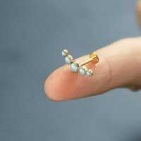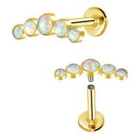 A minimalistic helix piercing and flat piercing model with five synthetic white opals welded together. This PVD gold plated steel labret is a perfect showcase of what type of steel piercing jewelry you can expect to discover in our extensive wholesale steel body jewelry collection.