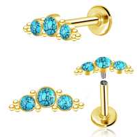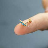 A very posh looking PVD gold treated steel labret created to be used in the upper ear as helix piercing or flat piercing. This version is decorated with turquoise cabochons, we also offer this labret piercing in more color variations in our huge wholesale steel body jewelry collection.