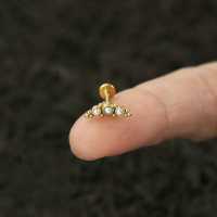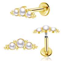 A very classy PVD gold plated steel labret designed to be worn in the upper part of the ear as helix piercing or flat piercing. This version is decorated with synthetic white pearls but this labret piercing is available in more colors in our huge wholesale steel body jewelry collection.