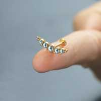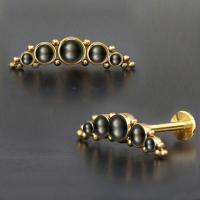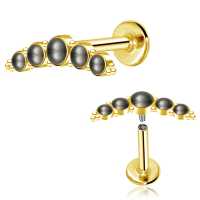 Here is our top of the line PVD gold plated steel piercing labret that we produce by welding 5 steel cups with black pearl cabochons together then decorate with tiny steel piercing balls. Designed to be used in the upper ear as flat piercing or helix piercing.