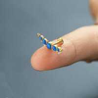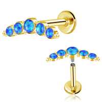 This top of the line PVD gold plated steel piercing labret is made by welding 5 steel cups with synthetic blue opals together and then decorating with steel piercing balls. Designed to be worn in the upper ear as flat piercing or helix piercing.