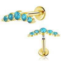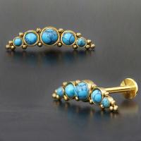 This is our top of the line PVD gold plated steel piercing labret that we make by welding five steel cups with turquoise cabochons together then methodically decorate with small steel piercing balls. Perfect to be used in the upper ear as flat piercing or helix piercing.