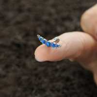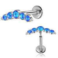 This top of the line high polished 316L steel piercing labret is made by welding 5 steel cups with synthetic blue opals together and then decorating with steel piercing balls. Perfect to be worn in the upper ear as flat piercing or helix piercing.