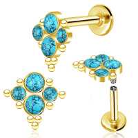 A very posh looking PVD gold plated steel labret produced with perfect precision welding by in our steel body jewelry workshop. This beautiful labret piercing is set with four synthetic blue opals. We recommend as lip piercing or flat piercing in the ear.