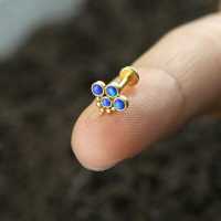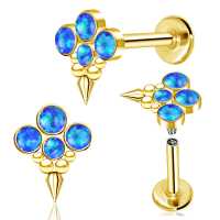 We always try to make some new interesting steel body jewelry designs here at Chaotic Trading. Here we showcase a PVD gold plated steel labret piercing with four synthetic blue opal cabochons, decorated with steel piercing balls and a little spike at the bottom. Exclusive to our online wholesale body jewelry collection.