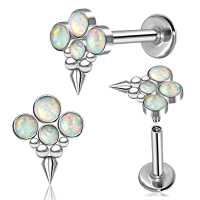 We are well known for making new and exiting steel body jewelry designs here at Chaotic Trading. This is a exclusive 316L steel labret piercing with four synthetic white opal cabochons, welded together with steel piercing balls and a little spike at the bottom. Exclusive to our online wholesale body jewelry collection.