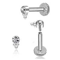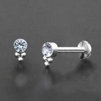 Hand-welded cluster piercing labret, using a 2mm cup with a bezel set clear zirconia crystal. This steel body piercing is ideal to be used as a flat piercing, tragus piercing as well as helix piercing.