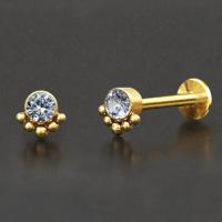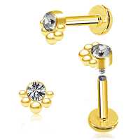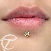 This PVD gold plated steel body piercing jewelry is nice to be used as a labret piercing, tragus piercing as well as lip piercing jewelry. With a simple crystal labret as the base with assorted steel balls welded to the side using a cluster piercing welding system.