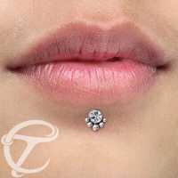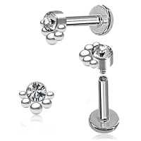 This steel body piercing jewelry is ideal to be used as a labret piercing, tragus piercing as well as lip piercing jewelry. Using a simple crystal labret as the base with assorted steel balls welded to the side using a cluster piercing welding system.