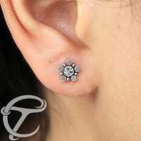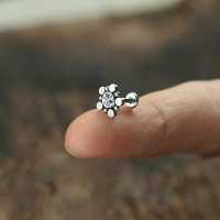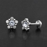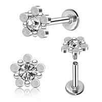 This unusual steel labret looks a little bit like a flower with steel discs and balls welded to the crystal labret piercing. Exclusively available at Chaotic Trading's wholesale steel piercing jewelry web shop.