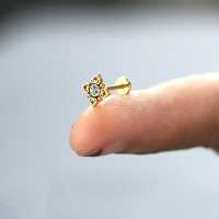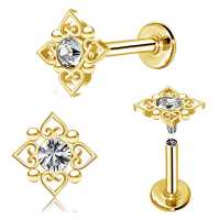 A classic PVD gold plated filigree steel labret model, A clear crystal labret in the center with small steel hearts and balls hand welded on the sides makes this a stunning labret to be worn as lip piercing jewelry or in the ear as flat piercing or tragus piercing.