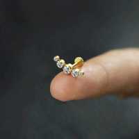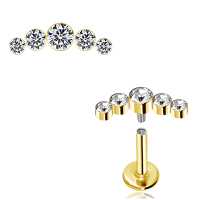 A quite large PVD gold coated crystal steel labret that looks great to wear as a flat piercing or helix piercing. Five crystals in different sizes welded together using our cluster piercing technique to create this exclusive steel body jewelry model.
