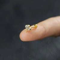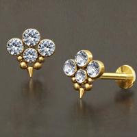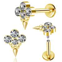 We always come out with new interesting steel body jewelry designs here at Chaotic Trading. Here we present a PVD gold plated steel labret piercing with four clear zironia crystals, decorated with steel piercing balls and a little spike at the bottom. Only available at our online wholesale body jewelry collection.