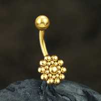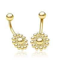 A very intricate geometric designed PVD gold plated steel banana bar hand crafted using our steel piercing cluster welding system. One of countless steel navel bars that we have on offer in our extensive wholesale steel body piercing assortment.
