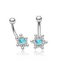 This star shaped steel navel bar has a turquoise inlay and has been hand crafted by our skilled smiths using a steel piercing cluster welding process. This steel banana bar is also available in black resin and abalone shell inlay in our wholesale steel body piercing jewelry collection.