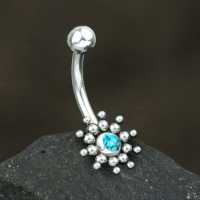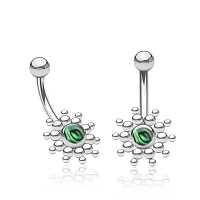 This flower inspired steel navel bar with an abalone shell inlay, has been hand welded by our talented artisans using a steel piercing cluster technique. These steel banana bars are available in turquoise as well black resin inlay in our wholesale steel body jewelry collection.
