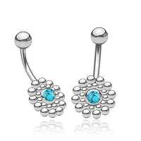 A beautiful geometric inspired steel navel bar with a turquoise inlay, professionally hand crafted by our skilled artisans practicing a steel piercing cluster welding process. These steel banana bars are available in turquoise as well abalone shell inlay in our huge wholesale steel body piercing jewelry assortment.