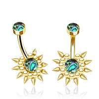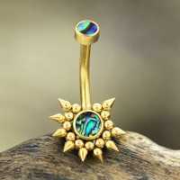 This hypoallergenic PVD Gold coated steel navel bar has been set with hand cut abalone shell and carefully hand welded by our steel jewelry smiths. We offer a very broad variety of affordable designs and shapes high quality wholesale body jewelry assortment.