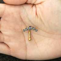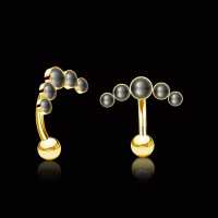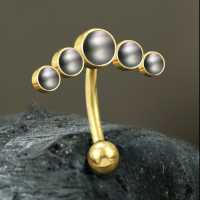A PVD gold plated steel navel bar set with synthetic black pearls available in our wholesale steel piercing collection. This is part of our hand made navel jewelry that is all produced by hand welding in our steel body piercing workshop.