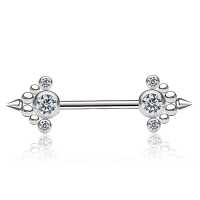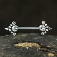 An arrow shaped nipple barbell created by carefully welding together steel piercing balls, steel spikes and set with crystals. This nipple piercing is available in many colors and variations in our wholesale nipple piecing jewelry section.