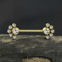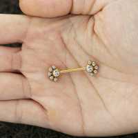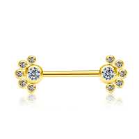 A simple flower inspired PVD gold plated nipple piercing barbell made from hypo allergenic steel piercing. We encourage any wholesale body jewelry customer whom are looking for unique nipple jewelry to explore our wholesale body piercing collection.