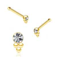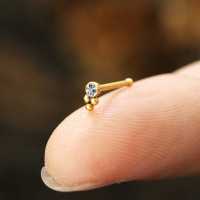 A PVD gold plated steel nose pin hand-welded to perfection then set with a clear zirconia crystal. A shining example of a unique nose stud from our wide assortment of nose bones and nose jewelry from our wholesale steel piercing assortment.