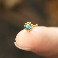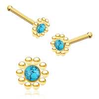 A flower shaped PVD gold plated steel nose stud with a synthetic turquoise cabochon hand welded using our piercing cluster technique. Make sure to browse through our full wholesale steel body piercing assortment not to miss out on any of our nose pins or other nose piercing jewelry.